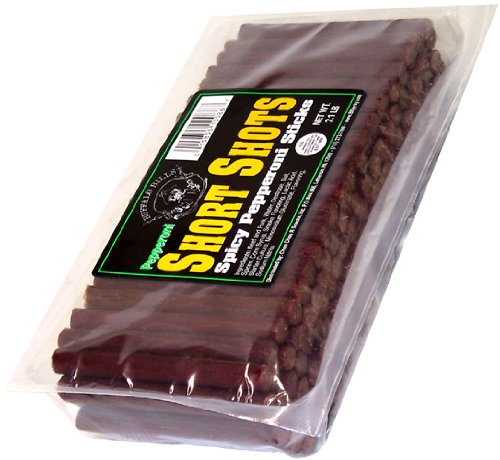 Our Pepperoni Short Shots feature a blend of beef, pork and Italian seasonings. Packed in a 2.1-lb bag (with roughly 120 sticks), these 3.75" beef and pork snack sticks have a big meaty mild flavor with a little taste of Italy. Introduced in 1994, our Short Shots continue to be a customer favorite year after year. Unlike our competitors that make their "beef sticks" with "mechanically separated chicken", our Short Shots are still made the old-fashion way with whole cuts of 100% US-raised beef. Customers love their quality, taste, and firm meaty texture. Buffalo Bills Short Shots are available in 3 great flavors - Mild, Hot, and Pepperoni.